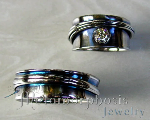 Continuous wrap-a-round wedding rings. Diamond bezel set on ladies engagement-band, matching gents band, 14k white gold with iridescent patinas.